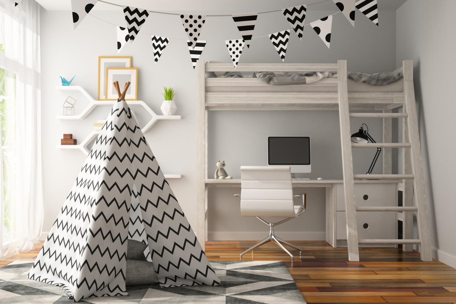A moderate and perky children room planned with a bird enclosure bed, a three shade closet and a specially crafted rack that together guarantee your youngster has all that he/she really wants.